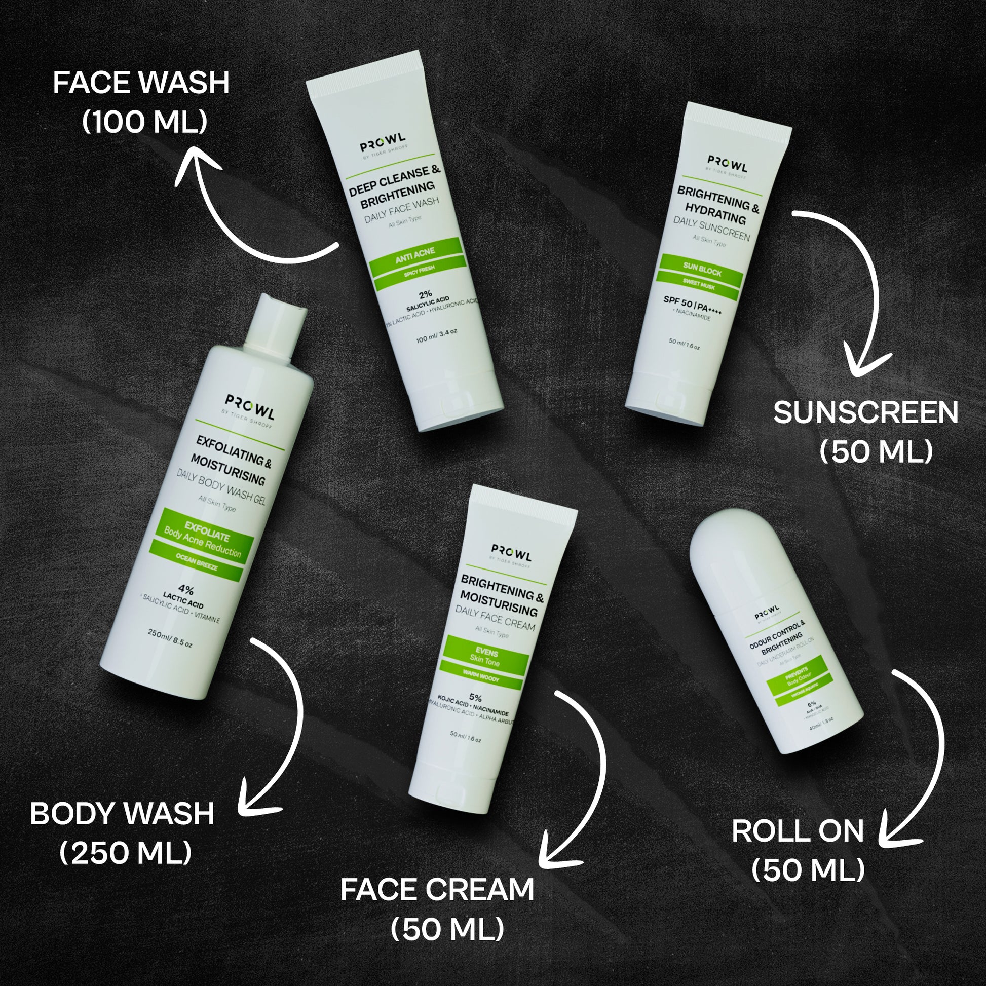 - FIGHTS ACNE, BODY ODOUR & ROUGH SKIN – Facewash with Salicylic Acid clears pimples and oil, while Body Wash with Salicylic & Lactic Acid targets body acne, clogged pores, and rough patches. Underarm Roll-On with AHA+BHA+Mandelic Acid reduces dark underarms, prevents odour, and keeps skin fresh all day.